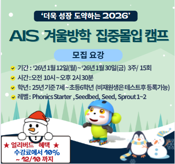 - Storytelling & Paragraph Writing 미국 공교육 Grade 2~3 수준의 어휘/언어능력 계발이웃, 자연, 발명, 운동과 같은 36개 주제를 기반으로 영어로 정보를 전달하고 다양한 문장으로 표현하는 단계